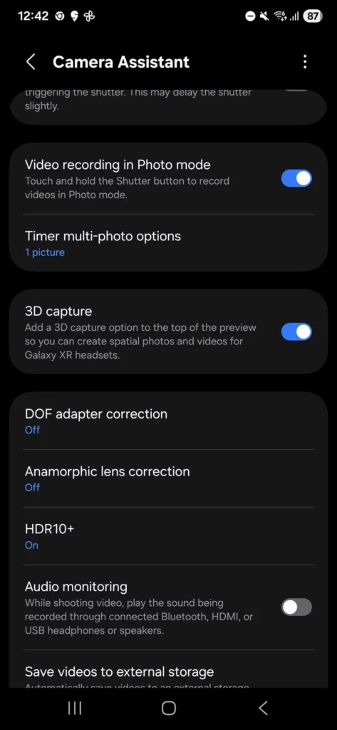 「3Dキャプチャ」では、カメラプレビュー上部に専用ボタンが追加され、Galaxy XR対応の立体写真や動画を撮影できるようになります。リーカーのIce Universe氏は、実際に4K 30fpsで撮影した動画を公開しており、ギャラリーアプリ上には「Shot in 3D」と表示されたと伝えています。